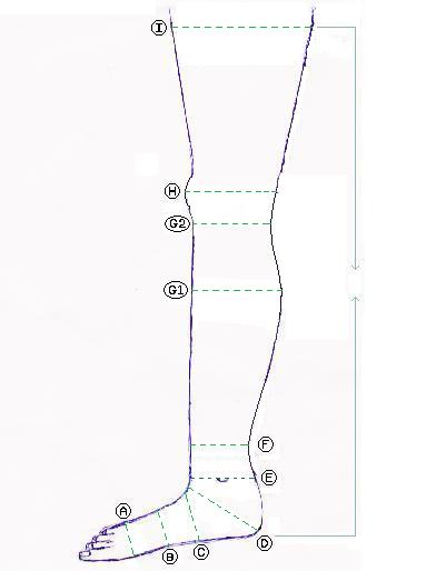 B - Arch: This is the circumference measurement of the center of your foot. C - Peak: This is the circumference measurement of the highest part of your foot. The soft ruler should be placed between the Center and the Heel of your foot, right under the highest part of your foot. D: This is the circumference measurement from the highest part of your foot to your heel. E - Ankle: This is the circumference measurement of your ankle. F - Above Ankle Measurement Set: The first measurement is the circumference measurement of the position slightly above your ankles. This position is the thinnest part of your lower leg. The second measurement is the height of this position measured from the ground. G1 - Calf Measurement Set: The first measurement is the circumference measurement of the widest part of your calf (lower leg). The second measurement is the height of this position measured from the ground. G2 - Under Knee Measurement Set: The first measurement is the circumference measurement above your calf, below your knee. This is the lower flex point that is thinner than the widest point of your calf. The second measurement is the height of this position measured from the ground. H - Knee Measurement Set: The first measurement is the circumference measurement of your knee. The second measurement is the height of this position measured from the ground. I - Thigh Measurement Set: When you order custom made thigh boots, you must indicate where your thigh boots end. The "Thigh Measurement Set" measures this end position. The first measurement is the circumference measurement of your thigh. The second measurement is the height of this position measured from the ground. |